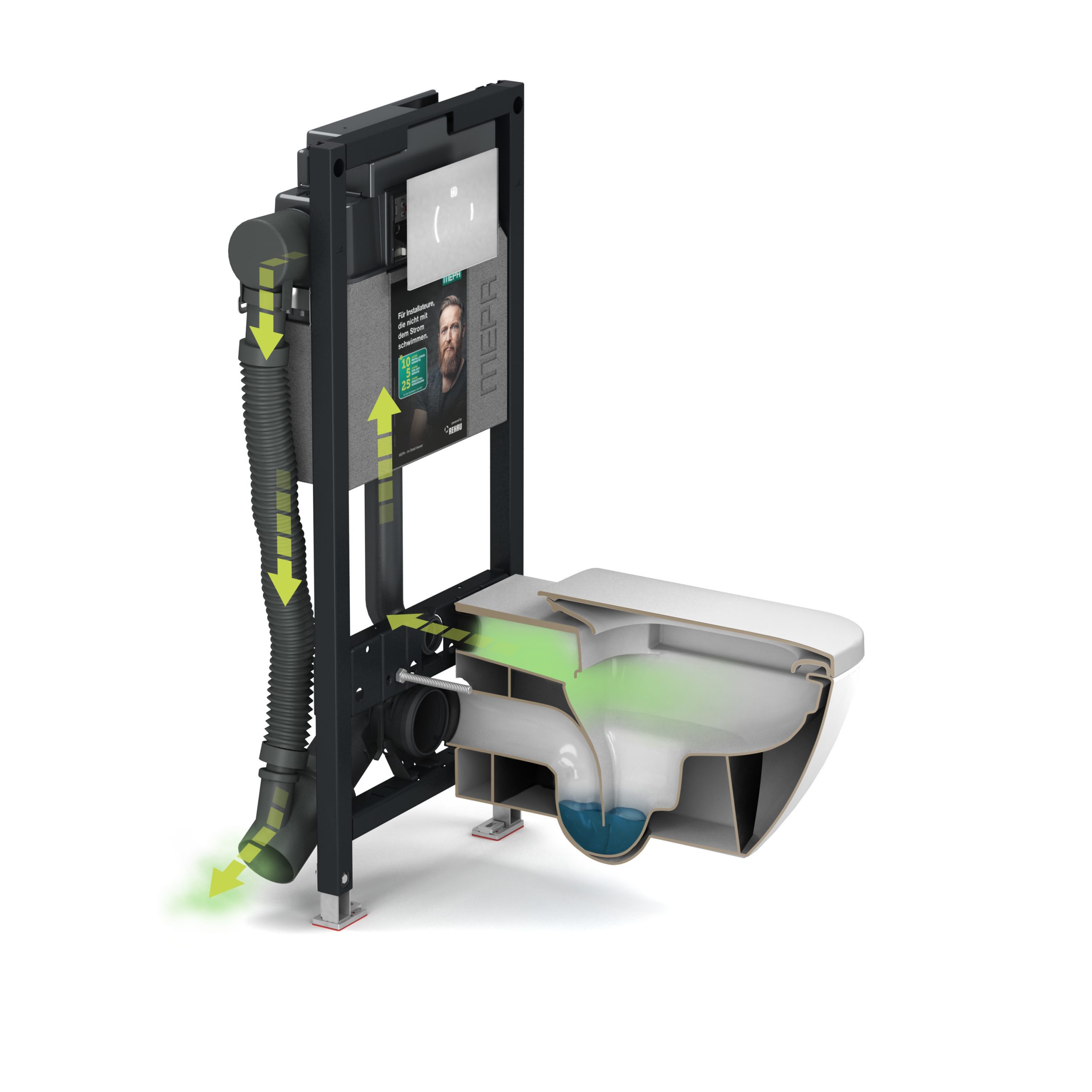 MEPA hat sich bei dem Air-WC bewusst für eine Abluftlösung entschieden, die unangenehme Gerüche direkt am Ort der Entstehung zuverlässig beseitigt. Andere Lösungen leiten die Luft oftmals lediglich durch einen Filter wieder zurück in das Bad (Umluftprinzip). Das Air-WC führt die belastete Luft vollständig aus dem Raum. Außerdem kommt das Air-WC ohne Filter aus – und damit auch ohne Folgekosten aufgrund von Filterwechsel oder Wartung.